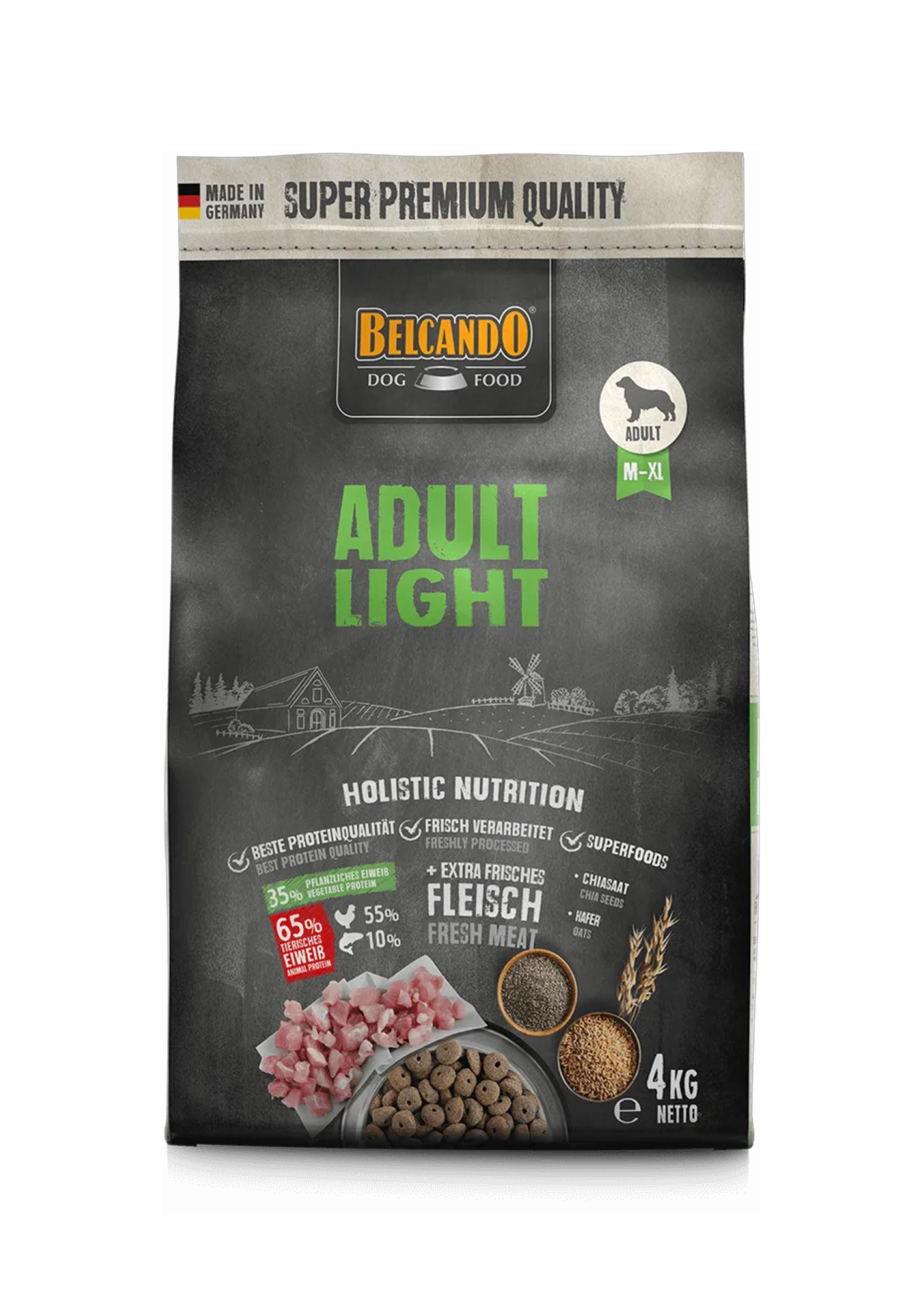 مكونات خام مختارة بعناية، ودواجن سهلة الهضم، وشوفان مُشبِع، وبذور شيا لتعزيز الهضم، تجعل بيلكاندو أدلت لايت طعامًا مثاليًا للكلاب قليلة النشاط والتي تعاني من زيادة الوزن. تم تقليل محتوى البروتين والدهون بشكل كبير، وتكييفه مع احتياجات هذه الكلاب. تضمن نسبة الألياف الخام العالية الحفاظ على وزن الكلب أو إنقاصه، وشعوره بالشبع بشكل مناسب. كما يساعد مركب البروتين إل-كارنيتين، الموجود طبيعيًا في اللحوم، على حرق الدهون.