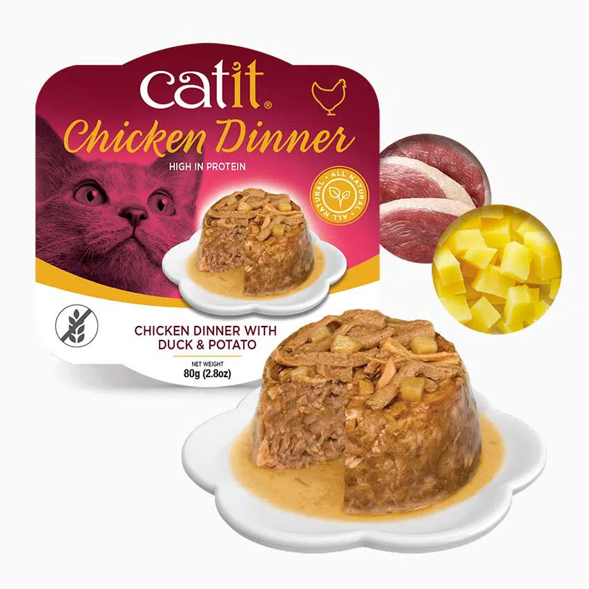 Ingredients: Chicken Broth, Water Sufficient for Processing, Chicken, Duck, Potato, Potato Starch, Chicken Liver, Eggs, Natural Flavors, Potassium Chloride, Tricalcium Phosphate, Locust Bean Gum, Sodium Carbonate, Salt, Xanthan Gum, Guar Gum, Magnesium Sulfate, Vitamins (Vitamin E Supplement, Thiamine Hydrochloride, Niacin, Vitamin A Supplement, Pyridoxine Hydrochloride, Biotin, Vitamin B12 Supplement), Taurine, Choline Chloride, Zinc Amino Acid Chelate, Iron Amino Acid Chelate, Manganese Amino Acid Chelate, Copper Amino Acid Chelate, Sodium Selenite, Potassium Iodide
