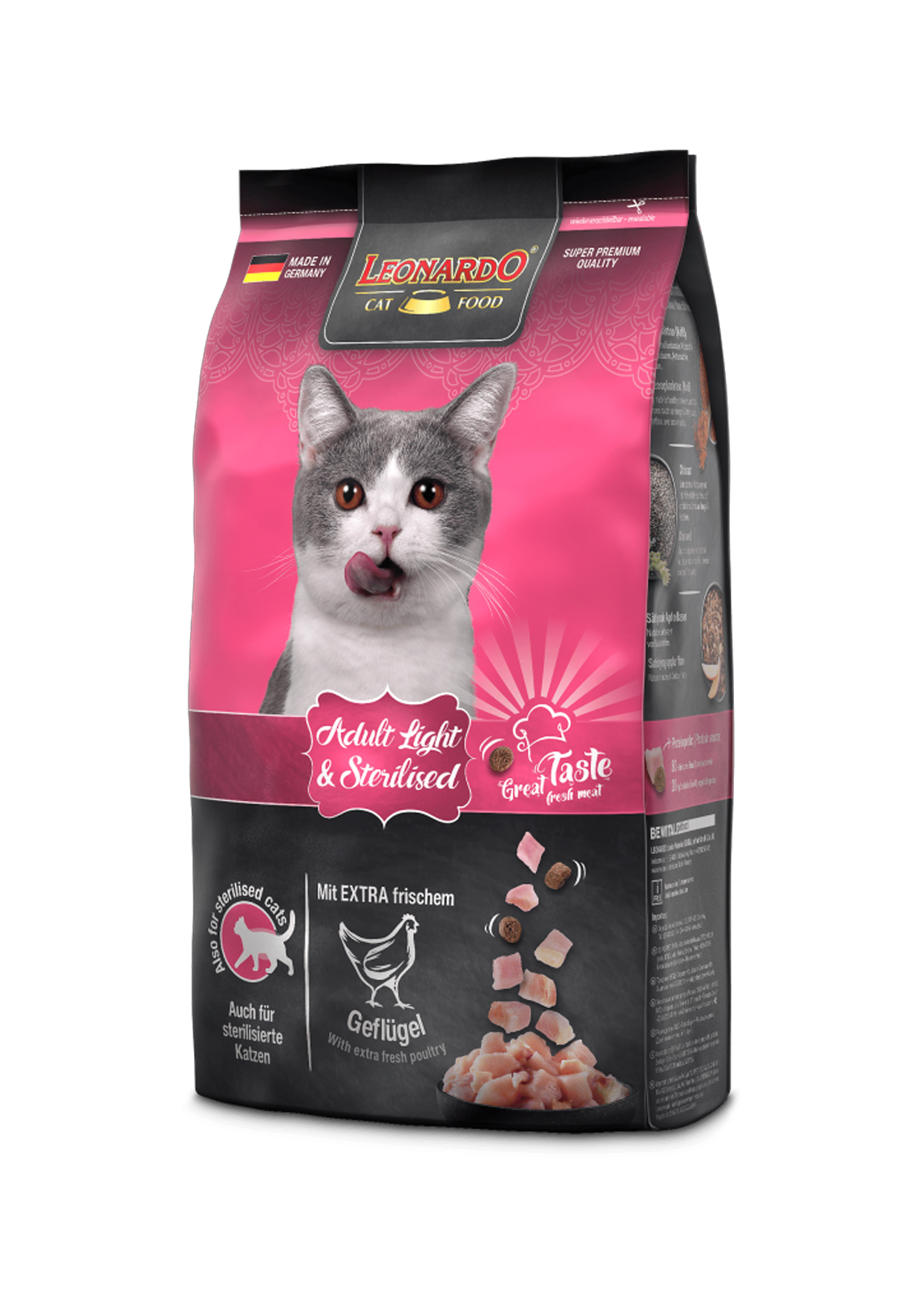 Leonardo Adult Light & Sterilized is a food made in Germany for sterilized cats with a tendency to become overweight.